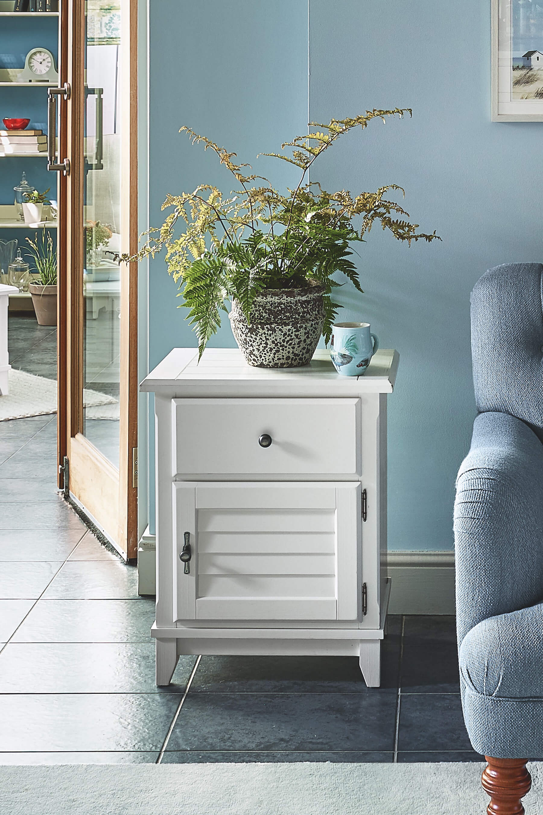 Hand-painted and lacquered, the Devon bedside table or sofa table with 1 louvered door and 1 drawer (with handle on the left) is a casual yet stylish piece of furniture. This piece of furniture will enhance any bedroom. There's plenty of storage space behind the blind-effect door, especially as the table has a drawer.