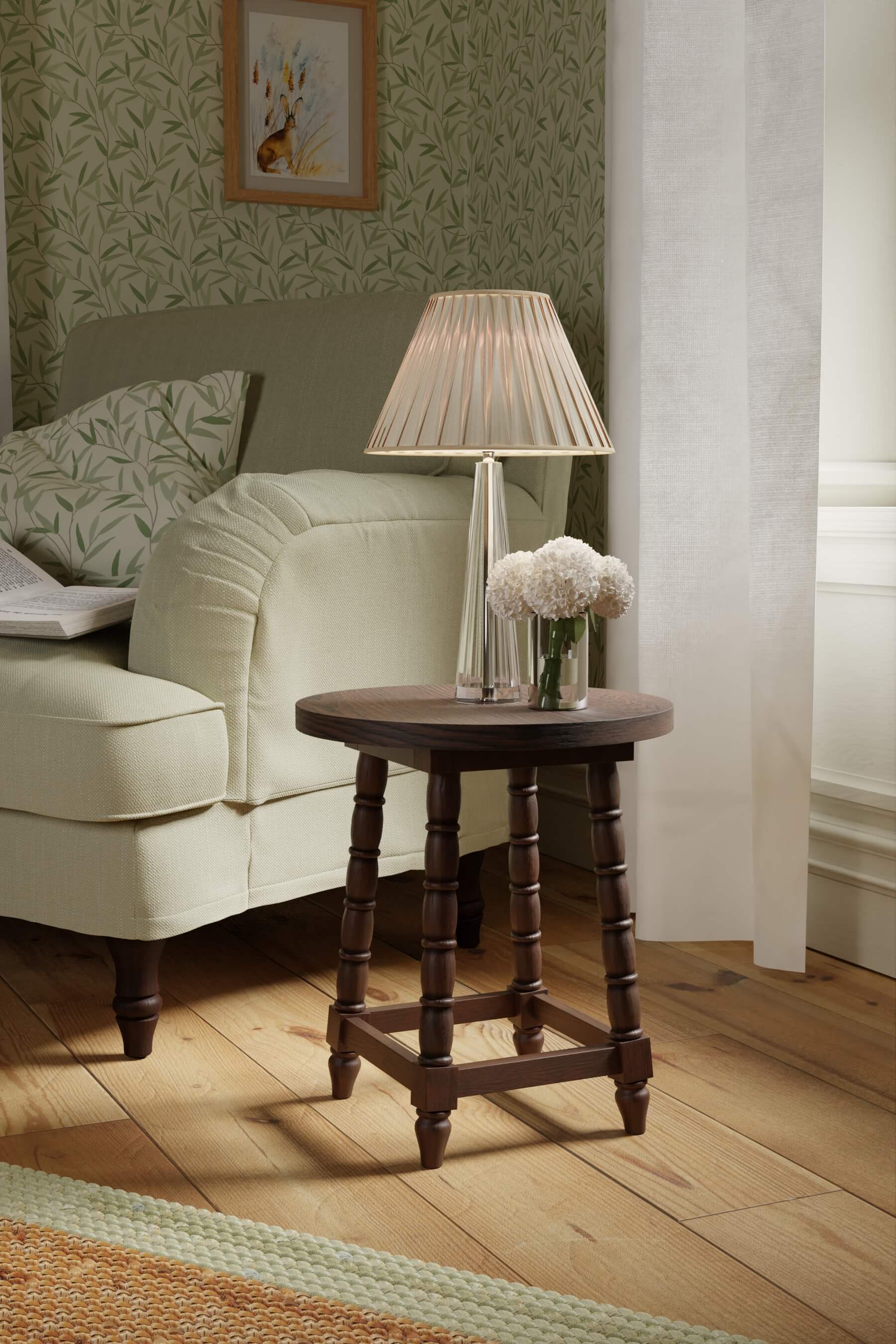 The Merdon bedside or sofa table is reminiscent of antique furniture, with its distinctive coil-shaped, turned legs and dark, stained finish. Furniture with coil-like elements is called "Bobbin" or "Spool" furniture. This type of furniture was widely produced in the second half of the 17th century and then became popular again in the 19th century. The name is derived from the similarity of the legs or armrests to the bobbins used in the textile industry to spin yarn. This time-honoured technique has been applied to this more traditional, cottage-style Merdon table.