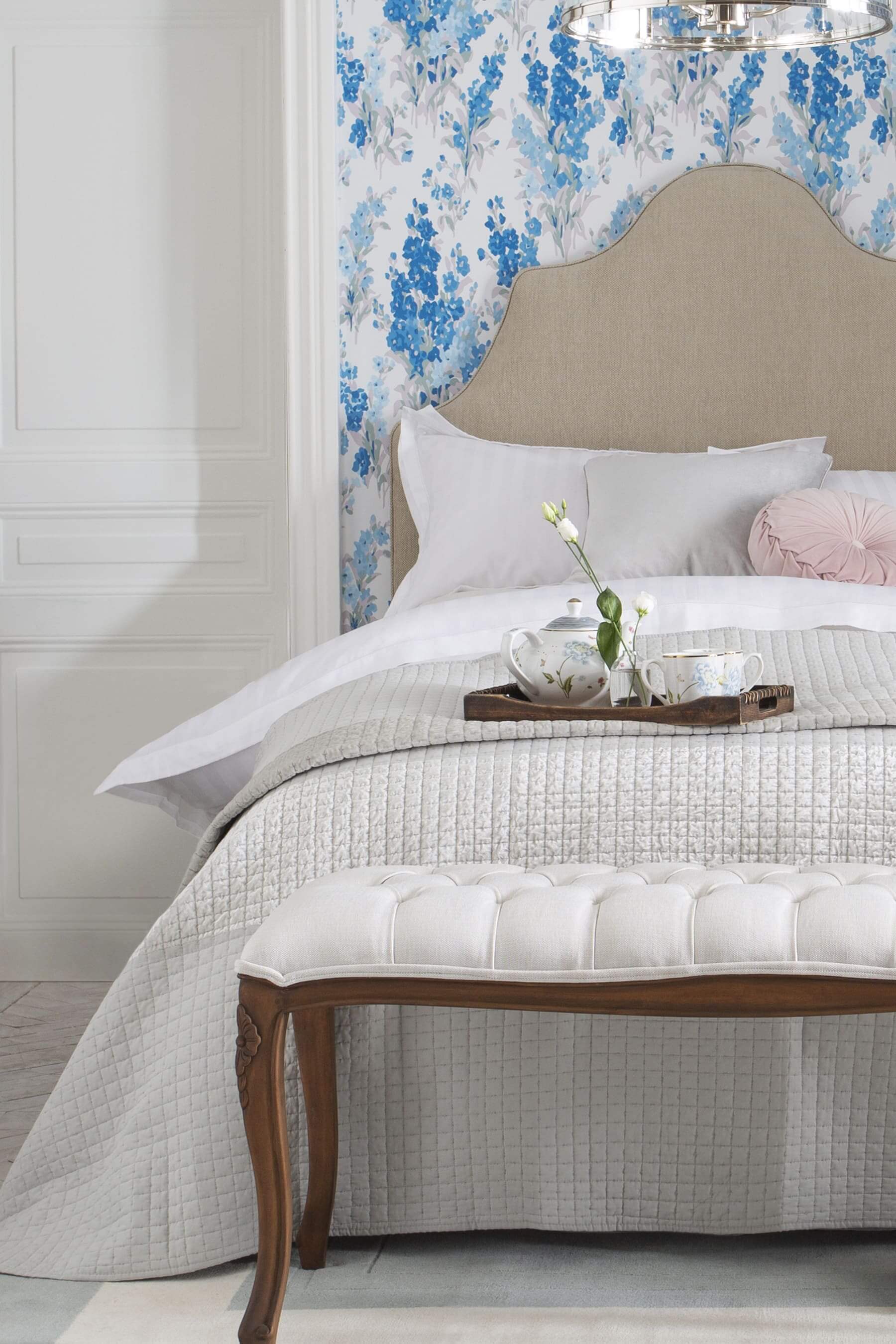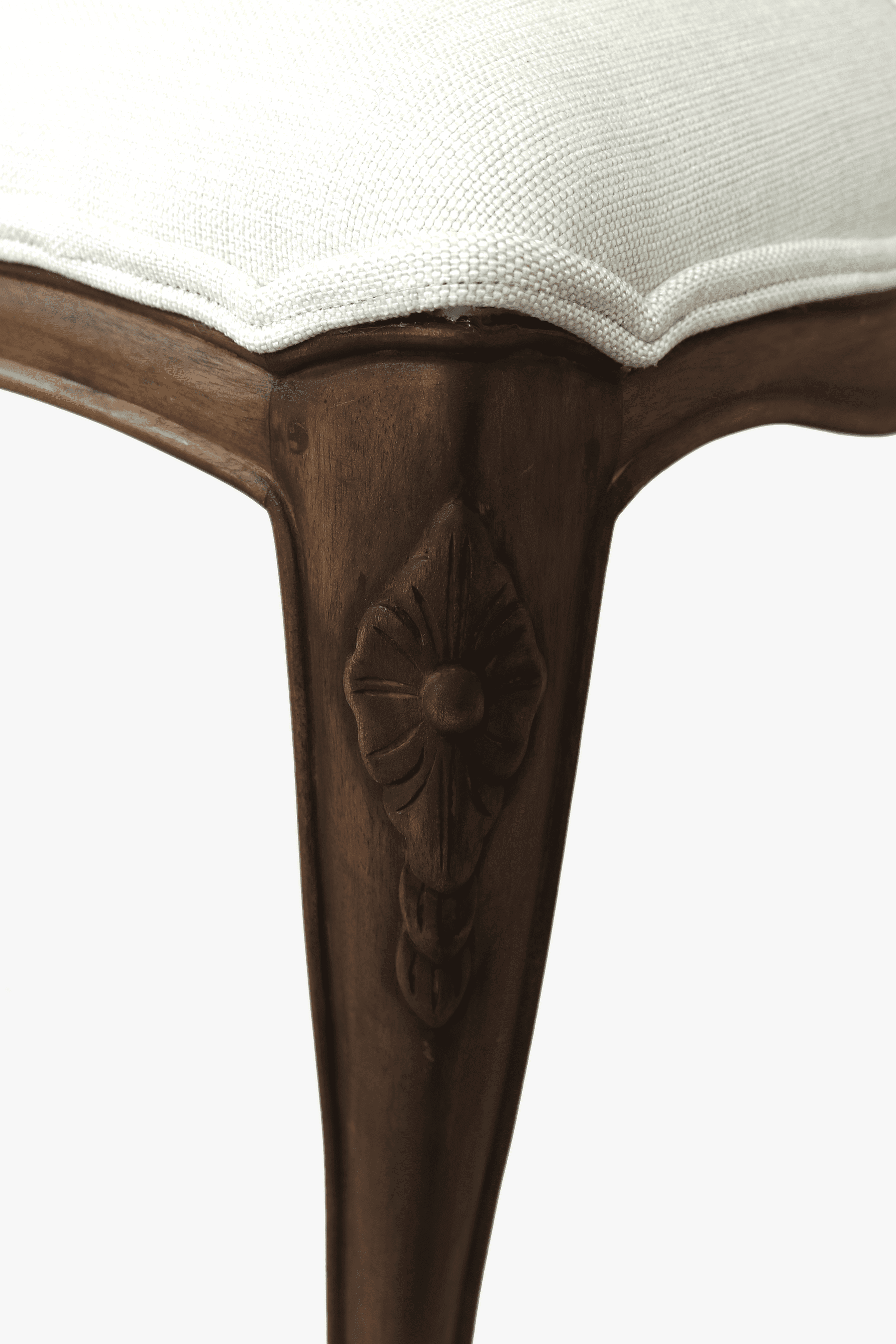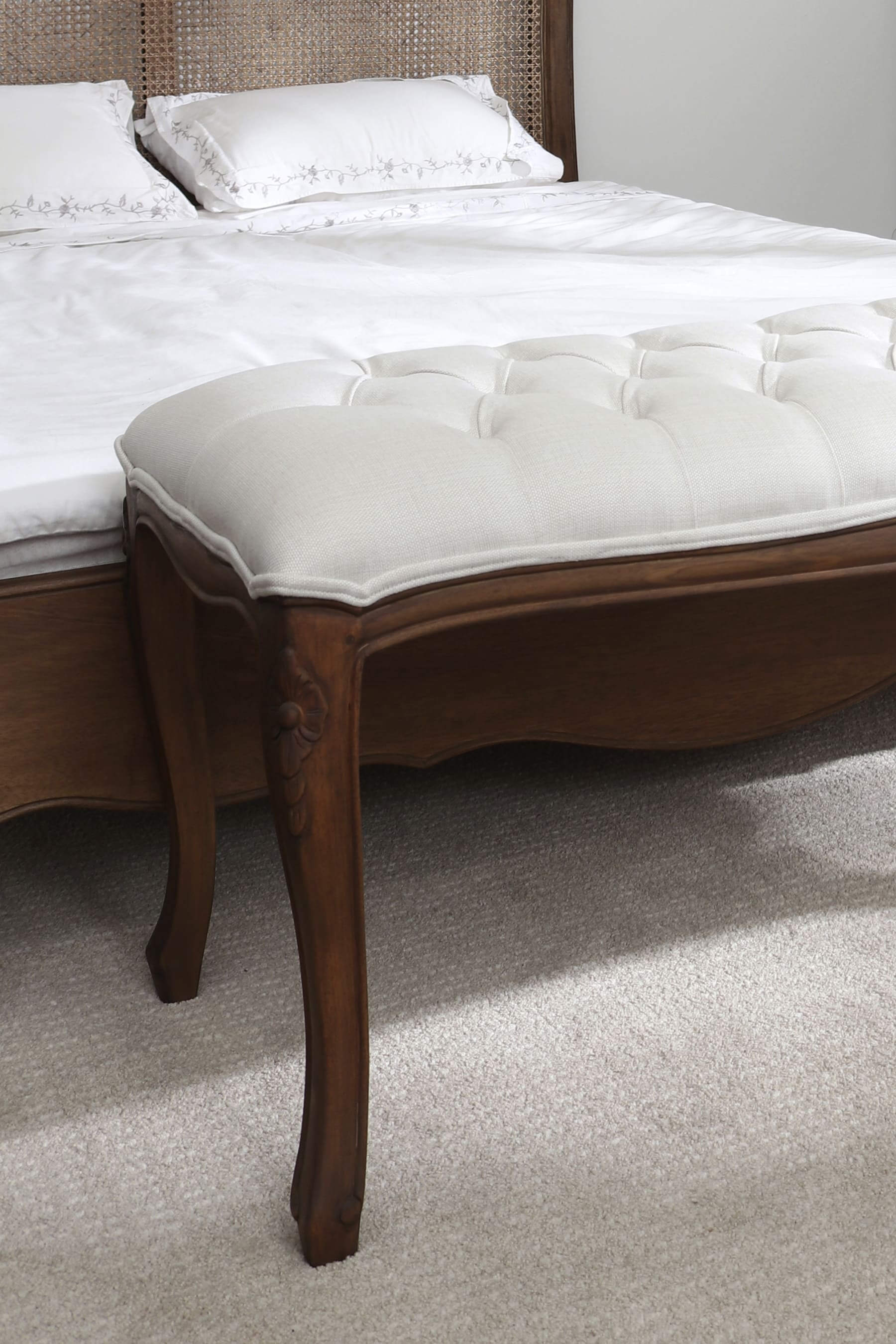 Inspired by elegant, French style, the Montpellier bench with its soft seat will enhance any room. This beautiful bench is made of solid wood and veneer. It is finished in aged walnut. The upholstery highlights classic French details such as cabriole legs and hand-carved details. The seat is quilted and covered with a pastel-coloured, plain-weave fabric and the interior is foam. It contrasts nicely with the wooden frame of the bench.