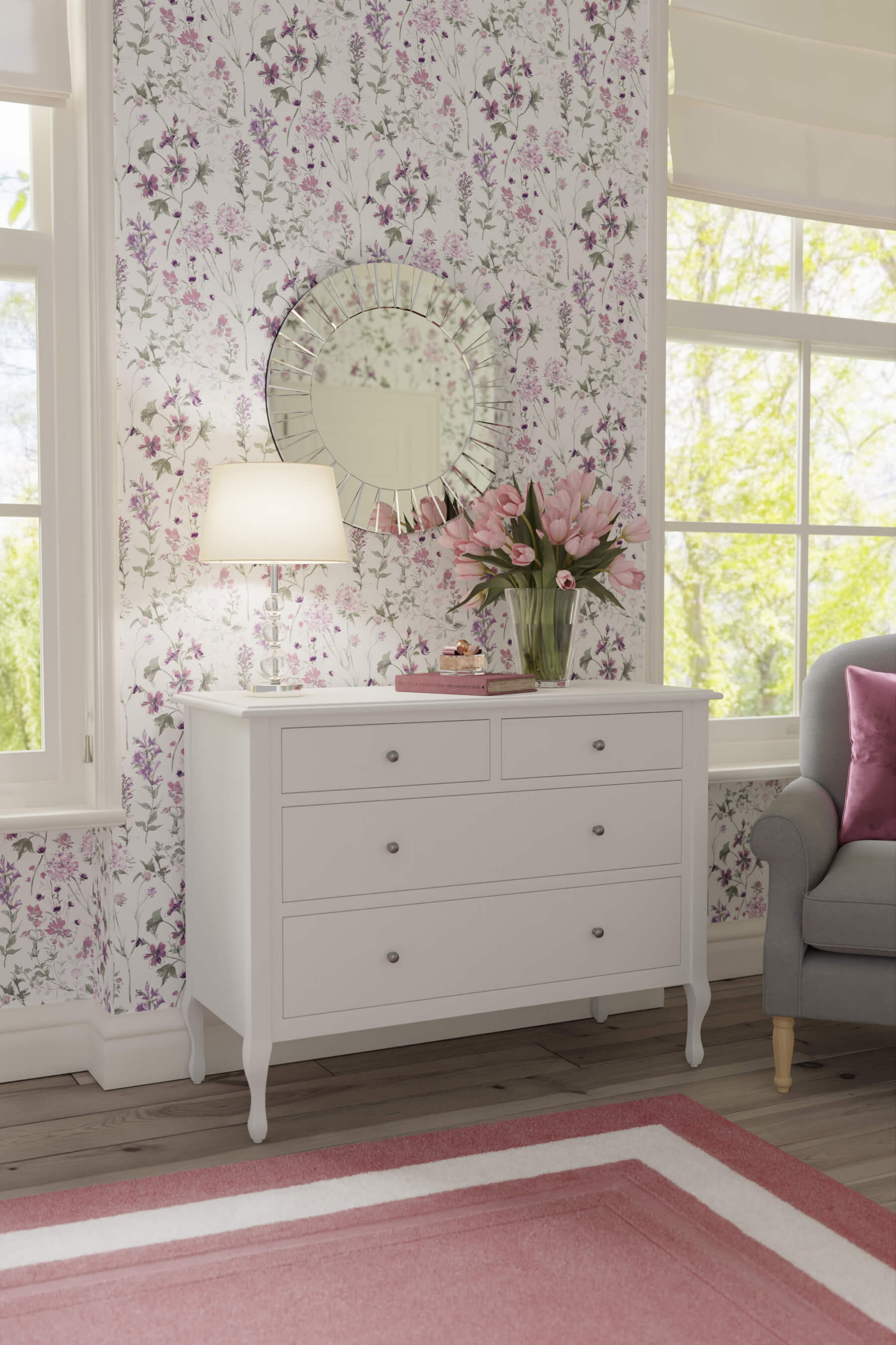 The Rosalind 4-drawer chest of drawers is inspired by the elegant shapes and graceful proportions of the French Rococo style, but with a slightly more contemporary design. The chest of drawers has two narrow drawers above two wide ones. All drawers are decorated with handsome and practical pewter handles. The worktop is distinguished by its fine, bevelled edges. The furniture is beautifully painted with long-lasting paint.