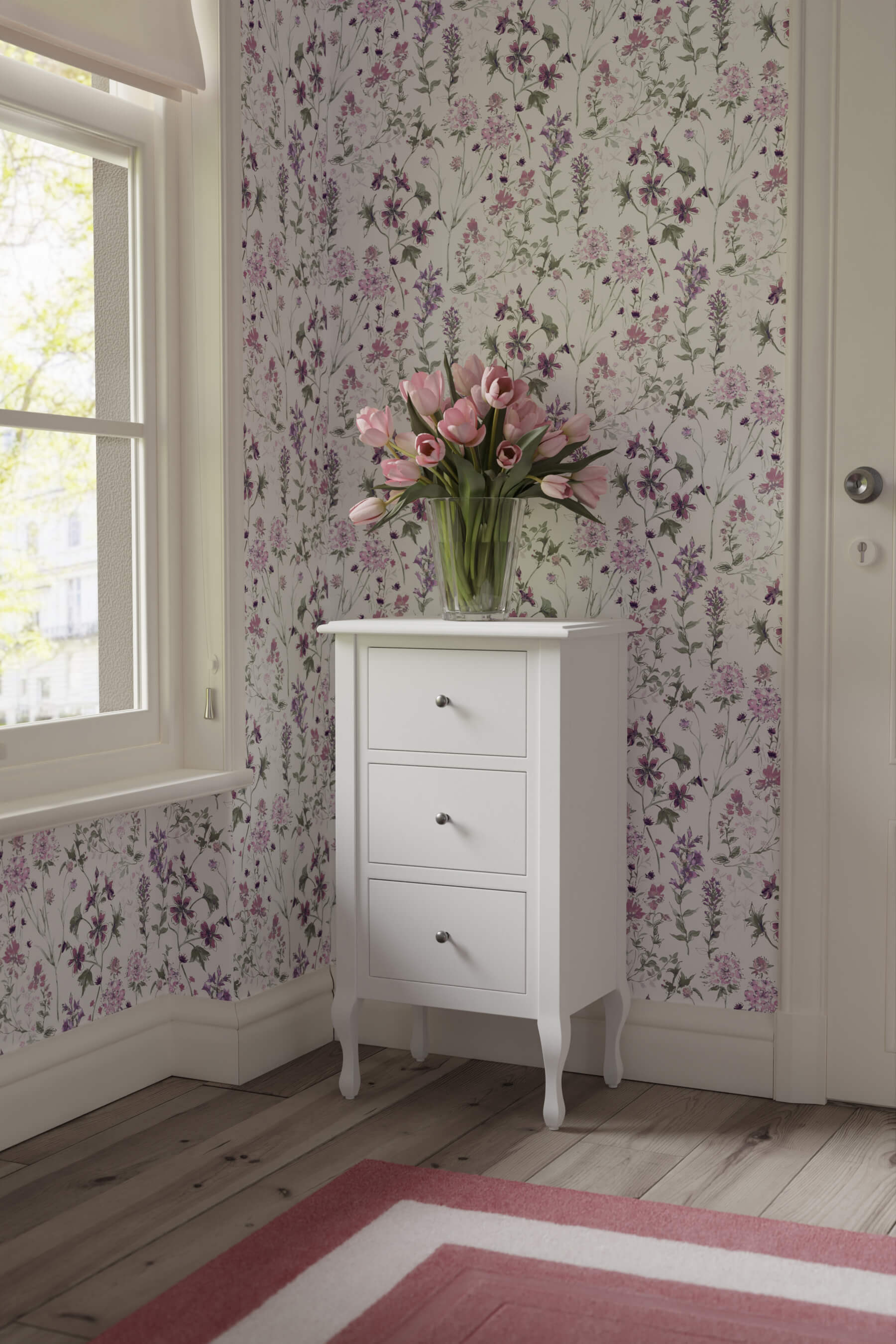The Rosalind 3-drawer tall chest of drawers is inspired by the elegant shapes and graceful proportions of the French Rococo style, but with a slightly more contemporary design. The chest has three drawers of the same size, decorated with pewter handles. Furniture is not only beautiful, it's also practical. The worktop is distinguished by its fine, bevelled edges. The furniture is beautifully painted with long-lasting paint.