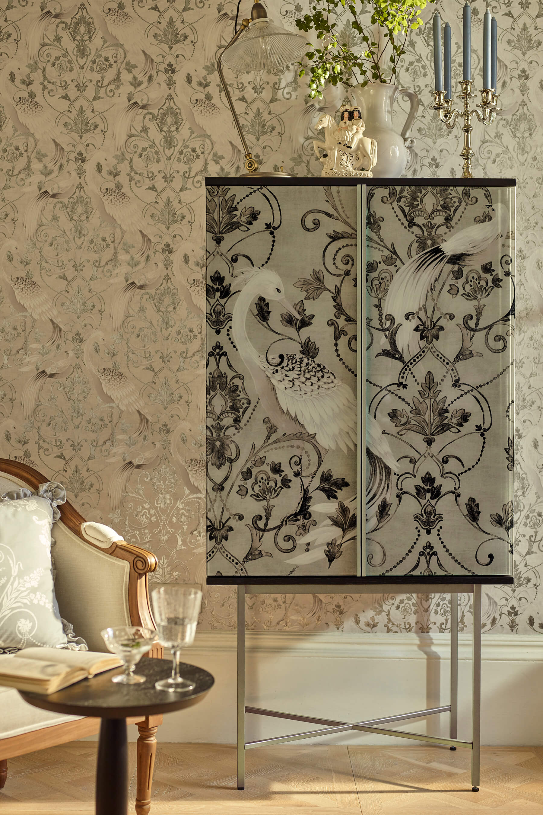 The Tregaron 2-door drinks cabinet is designed to celebrate the 70th anniversary of the Laura Ashley brand. The furniture is perfect for any occasion, not just brand anniversaries. This luxurious drinks cabinet is made of oak veneer, painted black and decorated with aged-look handles and the same base. However, it is the handsome front glass door, decorated with the "Tregaron Anniversary" pattern on a greyish background, that is the centre of attention. There's plenty of space for bottles and glasses. The cabinet also has a pull-out bar shelf, a mirrored section at the back of the cabinet and LED lighting. The 70th anniversary logo, printed on the inside of the door, is a nod to the occasion of the furniture's creation. The Tregaron 2-door drinks cabinet is packed in two boxes, so all you have to do is attach the top to the base to start using the furniture. No need to fully assemble.