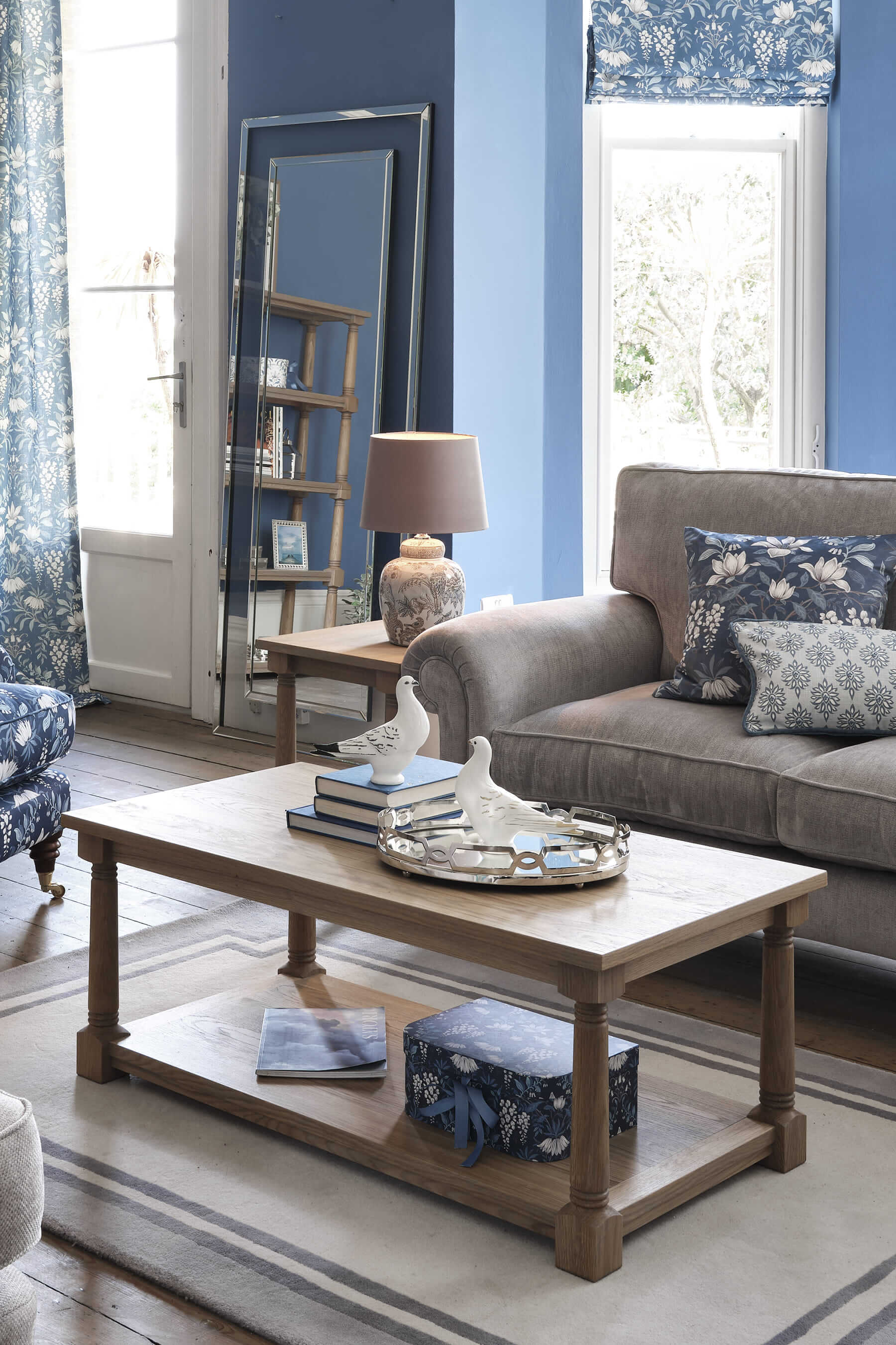 The rustic, faded oak Wellington coffee table has an oil finish for a refined, aged look. The furniture is personalised by its impressive column-shaped legs decorated with carvings. This stunning table will enhance any living room. It has a practical shelf at the bottom. The coffee table is made of solid oak and veneer. The shine of the table can be maintained by occasionally rubbing a little oil on it.